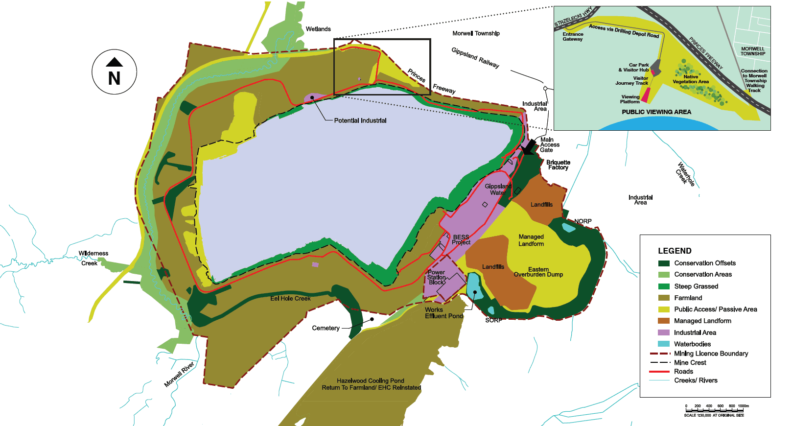A visitor interpretive platform is planned adjacent the Morwell township and the Princes Freeway on the north side of the mine. Services have been maintained to the areas previously occupied by the power station, buildings and/or workshops for future industrial re-use.